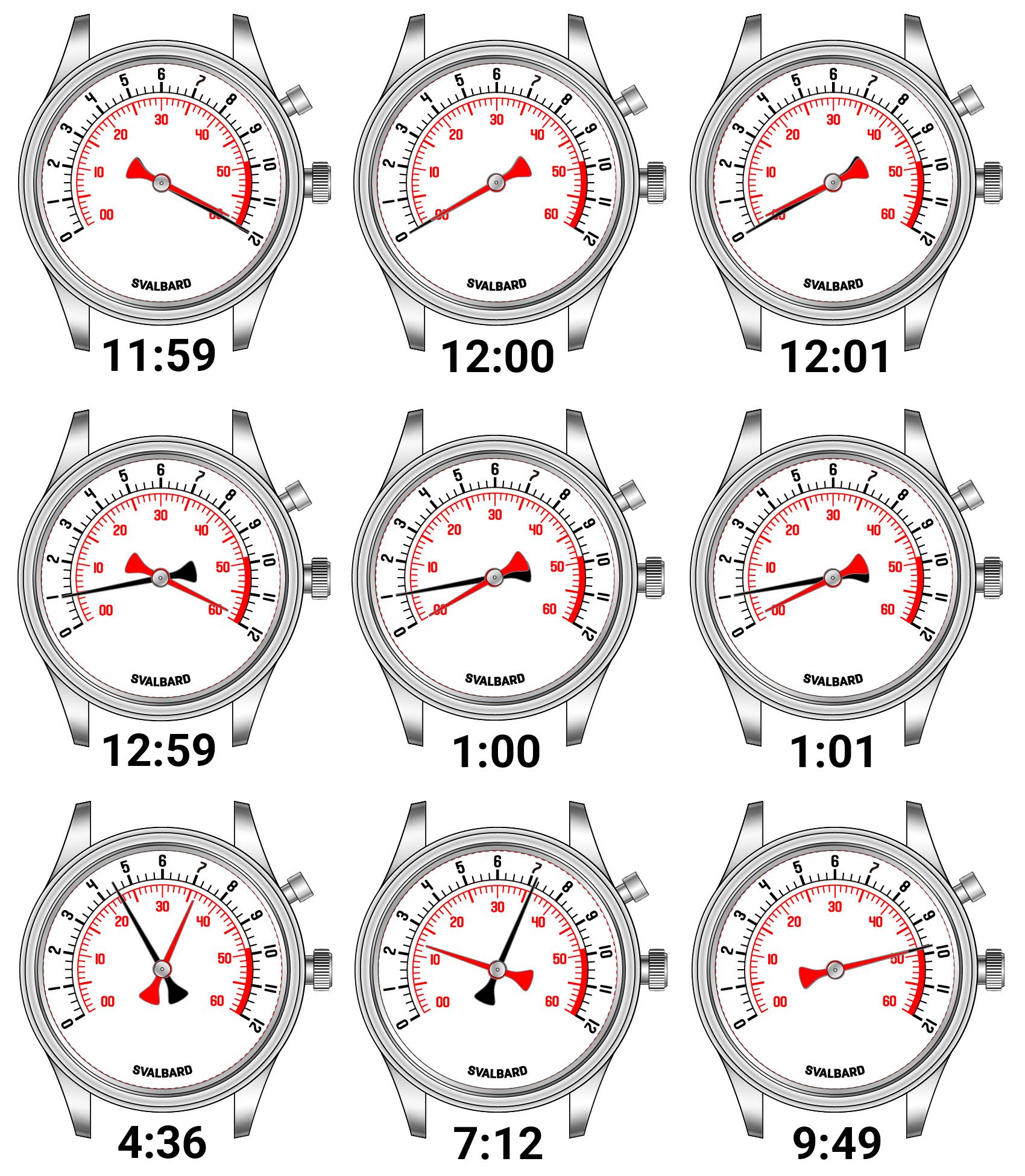White dial with black/red numbers and markings