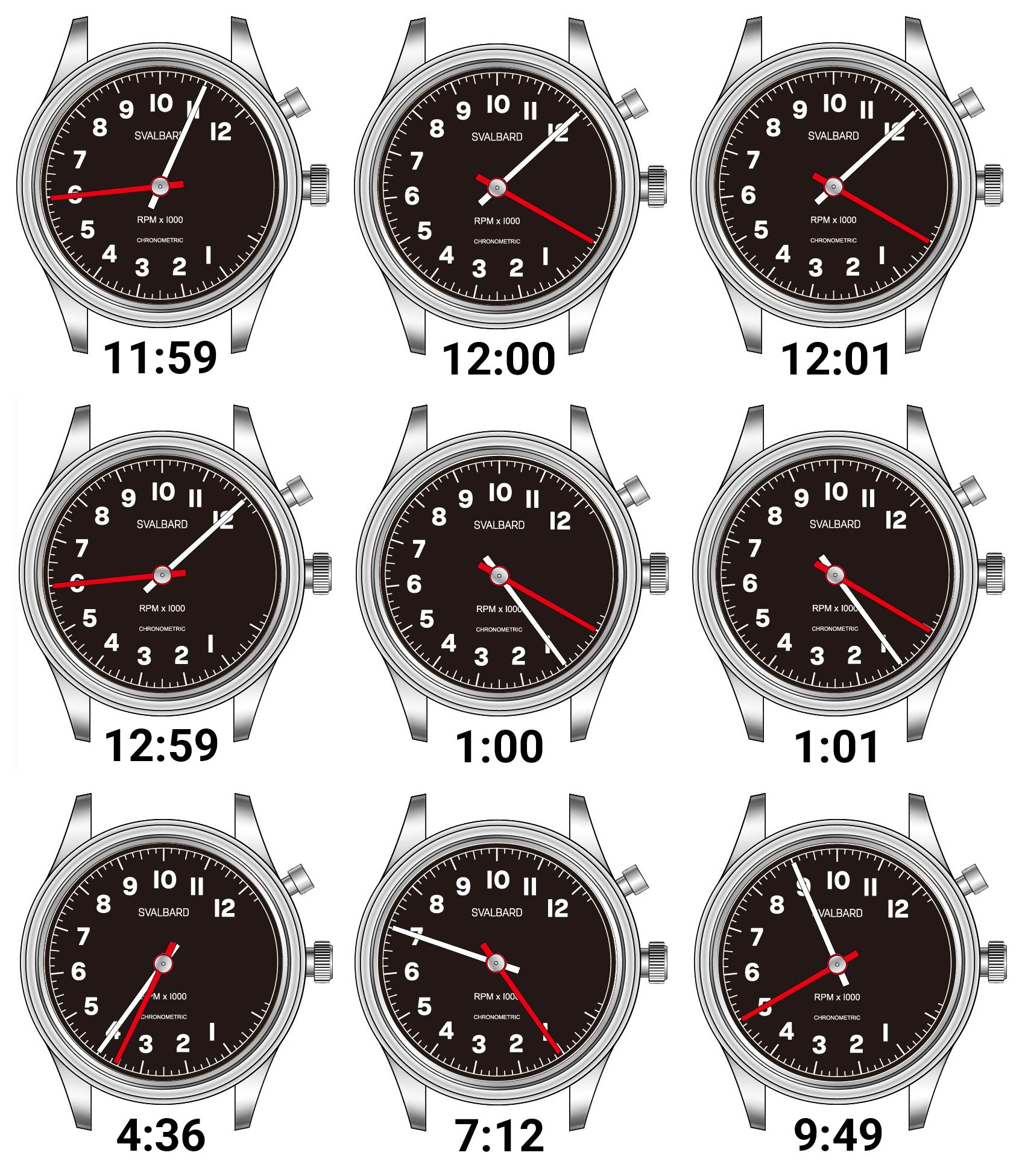 The both retrograde hands will move in an arc, and once it reaches the end (6) and (12), it snaps back to 0 and 1.